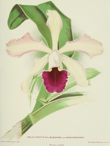 A special glory of Woodlands is the collection of L. elegans. In this house, where only the large plants are stored, we count five hundred; seven hundred more are scattered up and down. Nowhere in the world can be seen so many examples of this exquisite variety—certainly not in its birthplace, for there it is very nearly exterminated. In such a multitude, rare developments of form and colour must needs abound,[Pg 8] for no orchid is so variable. In fact, elegans is merely a title of convenience, with no scientific value. It dwells—soon we must say it dwelt—in the closest association with Laelia purpurata, Cattleya intermedia, and Cattleya guttata Leopoldii; by the intermingling of these three it was assuredly created. Mr. Rolfe has satisfied himself that the strain of Laelia purpurata is always present. By alliance with Catt. Leopoldii the dark forms were produced; by alliance with Catt. intermedia the white. Since that misty era, of course, cross-fertilisation has continued without ceasing, and the combinations are endless.