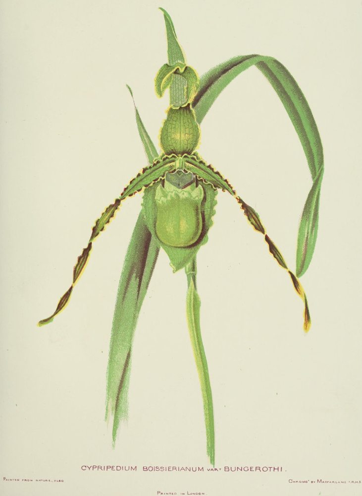 ‘... So I return to the argument. It has been seen that orchids are the latest and most finished work of the Creator; that the blessing was withheld from civilised man until, step by step, he gained the conditions necessary to receive it. Order and commerce in the first place; mechanical invention next, such as swift ships and easy communications; glass-houses, and a means of heating them which could be regulated with precision and maintained with no excessive care; knowledge both scientific and practical; the enthusiasm[Pg 4] of wealthy men; the thoughtful and patient labour of skilled servants—all these were needed to secure for us the delights of orchid culture. What boon granted to mankind stands in like case? I think of none. Is it unreasonable then to believe, as was said, that orchids were designed at their inception to comfort the elect in this anxious age?’[1]