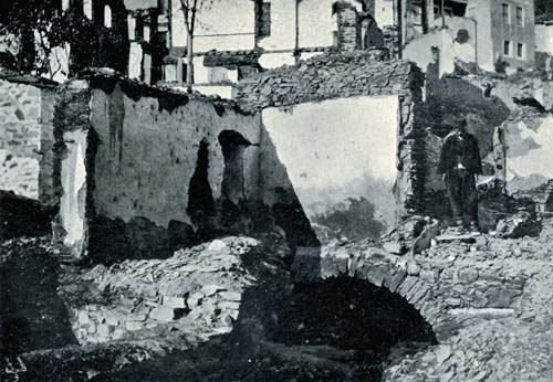 Krushevo was built on rock in a slight depression in the top of a range of mountains. The houses were constructed solidly of stone, with thick slate roofs all cut from the mountain-side. Hilmi Pasha had explained to me that the ‘unfortunate’ conflagration was caused by the explosion of shells, which, he argued, any civilised nation would have employed in capturing the town. Every house in Krushevo was ignited individually. The gates of six hundred houses which suffered only pillage bore the hacks of adzes and axes. Soldiers and bashi-bazouks, holding hands—as Turks do—still lurked about with their adzes in their[273] belts. On the walls, most of which still stood, stains of petroleum trailed down. I entered one house through which two cannon balls had passed. But there was not a mark of flame as a result.