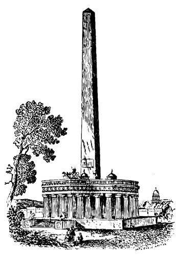 A tetrastyle portico (4 columns in front) in triple rows of the same proportions and order with the columns of the colonnade, distinguishes the entrance to the Monument, and serves as a pedestal for the triumphal car and statue of the illustrious Chief; the steps of this portico are flanked by massive blockings, surmounted by appropriate figures and trophies.