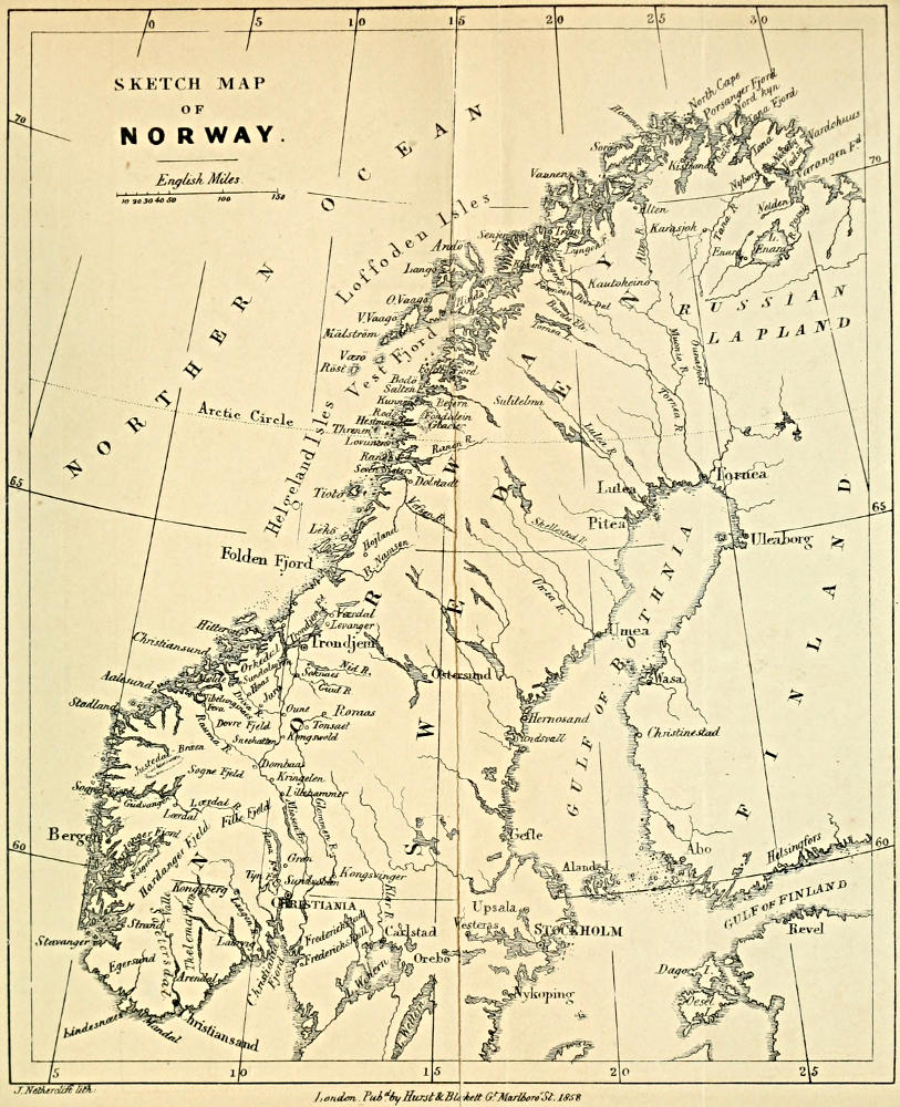 | The safest day in the year for travelling—A collision—Lighthouses on the Norwegian coast—Olaf the Holy and the necromancers—The cathedral at Stavanger—A Norwegian M.P.—Broad sheets—The great man unbends—Jaederen’s Rev—Old friends at Christiansand—Too fast—The Lammer’s schism—Its beneficial effects—Roman Catholic Propagandism—A thievish archbishop—Historical memoranda at Frederickshal—The Falls of the Glommen—A Department of Woods and Forests established in Norway—Conflagrations—A problem, and how it was solved—Author sees a mirage—Homewards | pp. 316-327 |