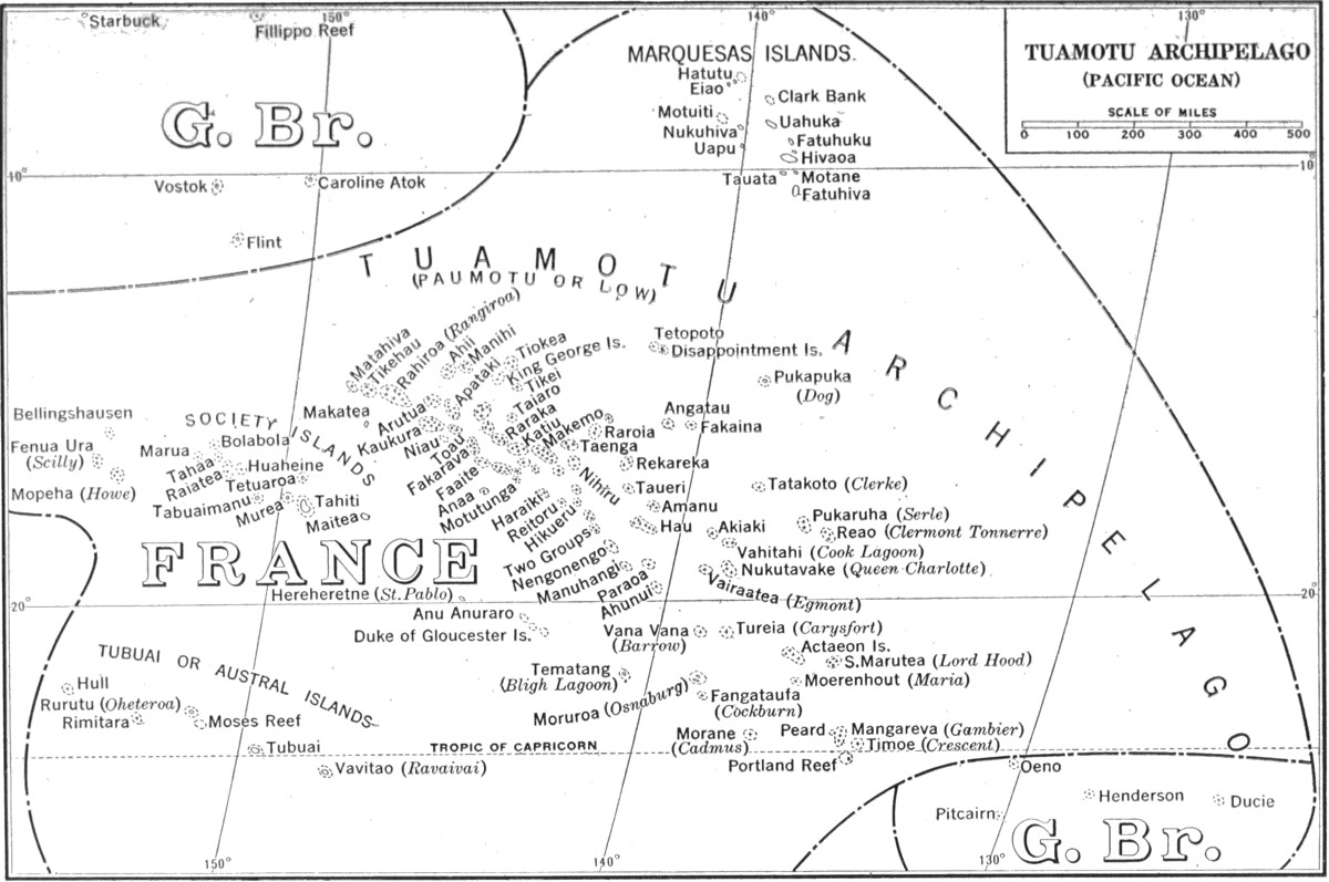 | Perilous navigation—Curious green sky—Arrival at Anaa—Religion and the movies—Character of Paumotuans | 40 |