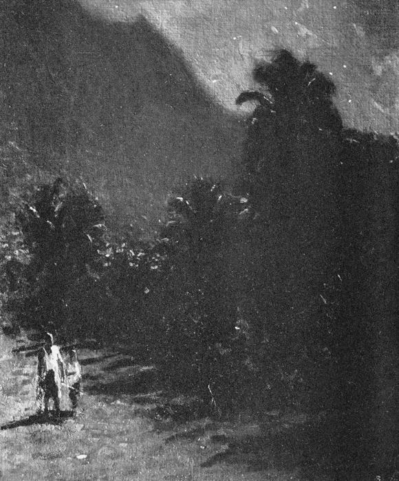 I had my possessions already on the schooner, and, forbidding Nohea to wait with me at the mole, I embraced him and left him. A wish to look at the grave took hold of me, and I walked along the path to it. The sun, though below the horizon, was lessening the sombrous color of the small hours, and I could discern vaguely the outline of the walled burial-ground. The splash of oars in the water and the rattle of rowlocks warned me of the approach of the boat for me, but I still had five minutes.