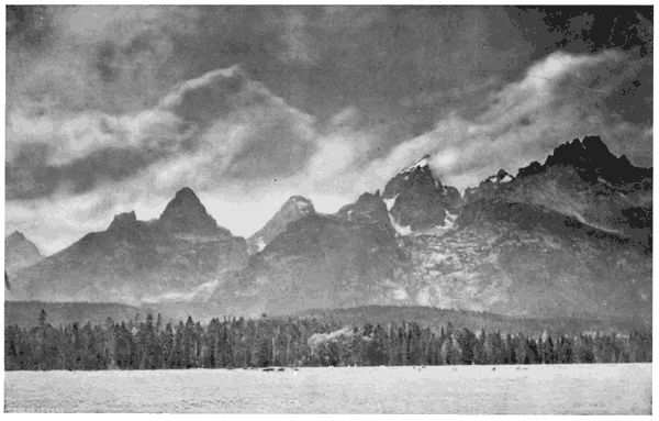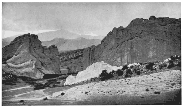 The point of view is on Trinchera Creek looking north from an altitude of about 8000 feet. To the left is the San Luis Valley through which flows the Rio Grande, and to the right are the two high passes known as Veta and Sangre de Cristo. The Sierra Blanca forms the southern end of the Sangre de Cristo Range and was one of the great landmarks of the Wilderness.