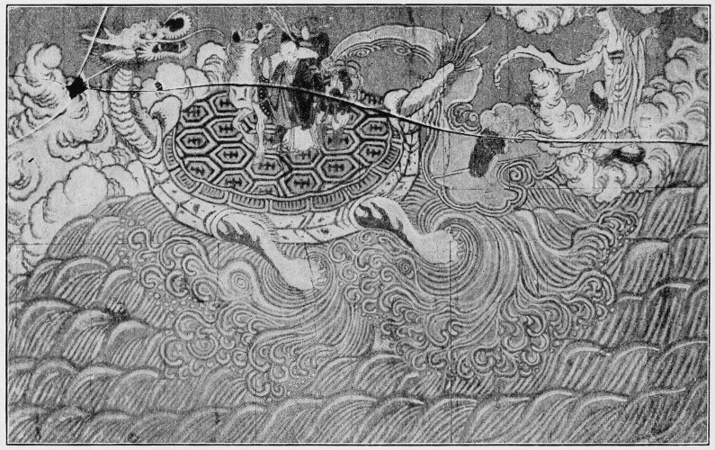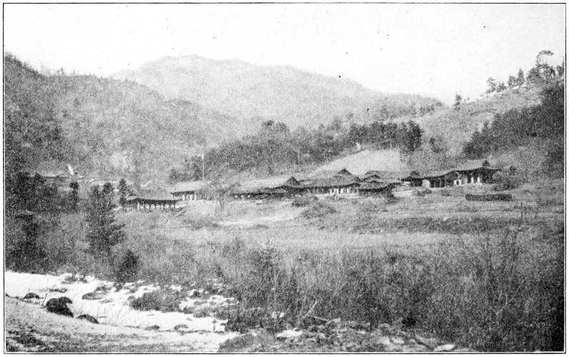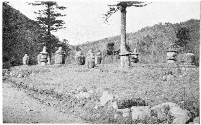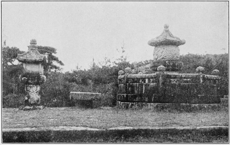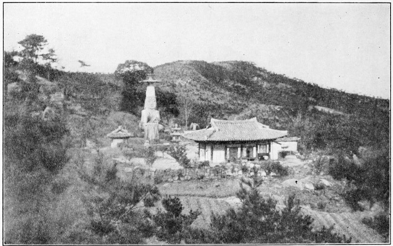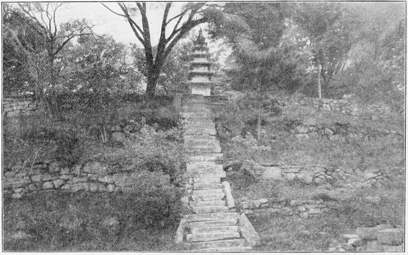 We are told that in the year 378, as the result of the coming of these foreign priests, the city of P’yeng-Yang was laid out as a great ship. To us this sounds strange. It is not easy for us to realize that a city was really regarded as a great ship and that a mast was erected in its midst, apparently in order that the sails of prosperity might waft the ship to good fortune and success. 6 Outside the city were stone posts to which the ship was to be tied up, and for many years it was forbidden to dig wells in the city because it was feared that if a well were dug, the boat would spring a leak and the whole place would be foundered. Such was science in the fourth century. It seems strange to us now, but ideas of that kind were rife in those days; in fact they have not yet disappeared from popular thought in Korea. I am not sure whether such ideas are connected with Buddhism, or whether they only form a part of that old geomantic philosophy which has so greatly influenced China, Korea and Japan through centuries. We find geomantic survivals of many kinds in many places. Old masts are scattered all over Korea, here and there, sometimes in quite inaccessible places; built of wood, they rise to a great height, and are sheathed with metal, which may bear an inscription and date. Many other places than P’yeng-Yang were thought of as great ships—temples, cities, entire valleys. (Plate VII.)