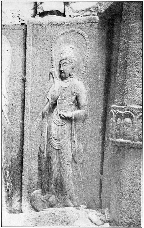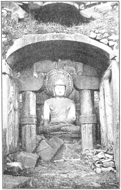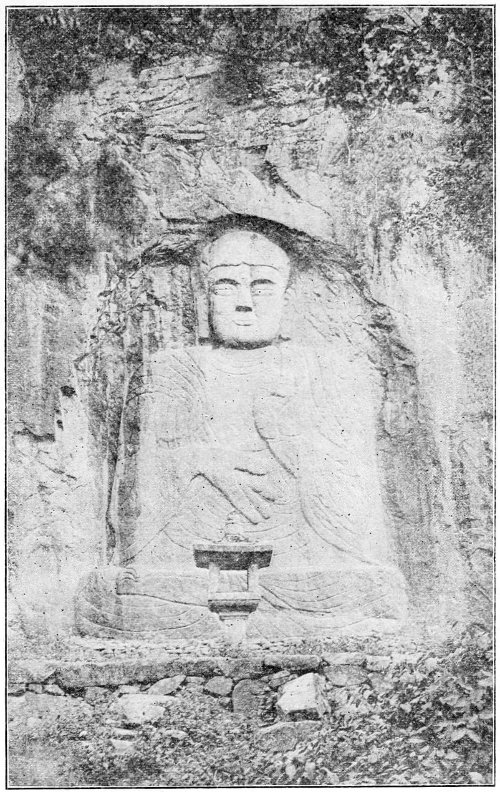 But the special interest these facts have for us in connection with the great Buddha lies in the fact that it may have been here that Buddhism itself first entered Pakche. Buddhism was a foreign importation, being sent to the peninsular kingdoms by the Eastern Tsin dynasty of China (A.D. 317-19) and effecting an entrance almost simultaneously at two points—in the north into Koguryu and in the south into Pakche. Of this latter event the native historians tell us:—“In the year A.D. 384 the barbarian monk Maranant’a came from Tsin. King Chip-yu accorded him a most courteous and ceremonious reception and Buddhism was established as the national religion.” We do not know at what point the monk-missionary landed, but it is not so unlikely that he may have come to this well-known port, and that one day among the ships making up that inextricable mass of masts and rudders at Si-jin there may have come the imperial junk of Tsin bearing “the barbarian monk Maranant’a” with his images, incense, bells, books and vestments to plant in Korea that cult which was to dominate the people for a thousand years, thus landing close to the place where in later years the greatest monument that Buddhism possesses was to stand. And two hundred years later (A.D. 552) there probably embarked from this port that band of Pakche priests sent by their king to carry to the mikado of Japan the golden images of Buddha and the triad of precious ones, the sutras and sacred books, and to give the faith of Buddhism to the Sun-rise Empire. And it is said that these relics exist to this day and are preserved in the city of Nagano in Japan. Colossal Buddha: p. 62.