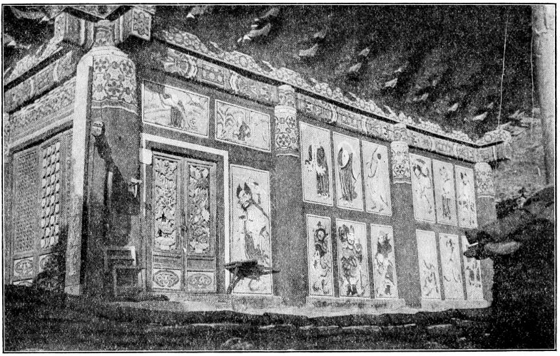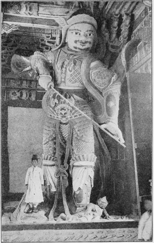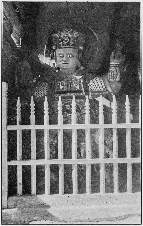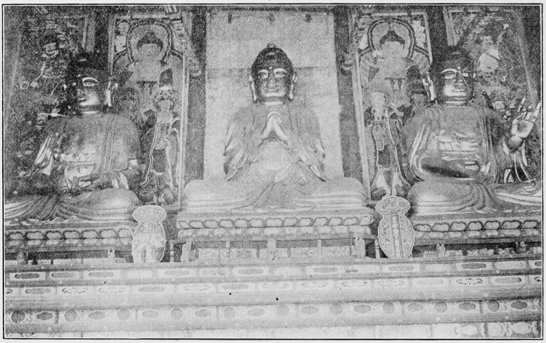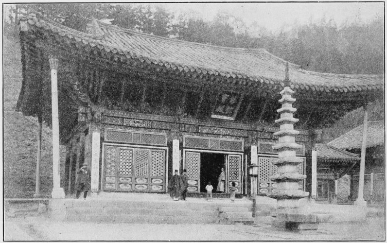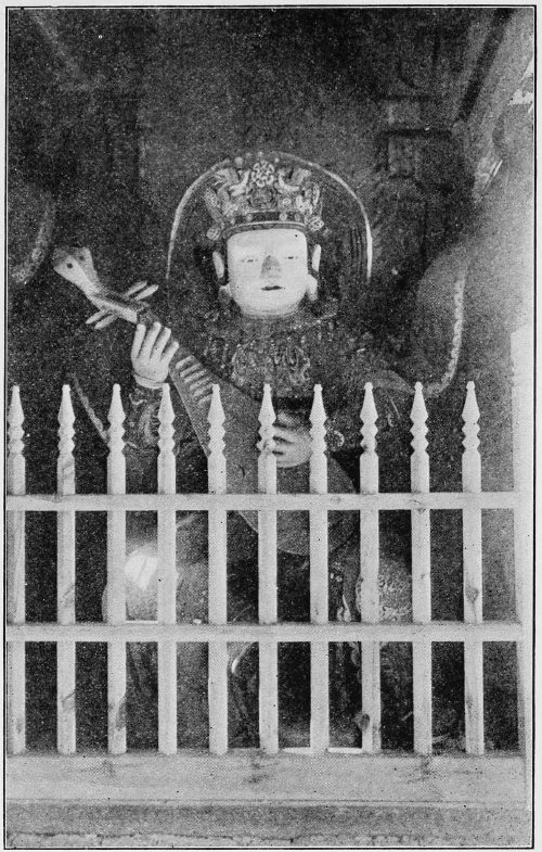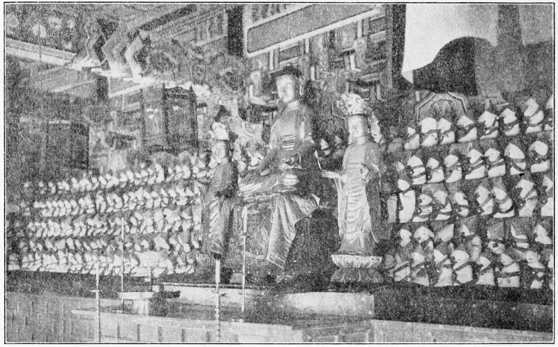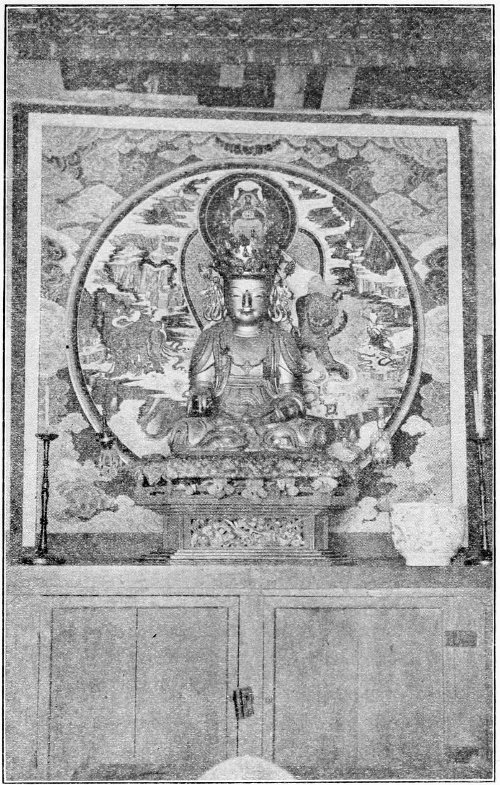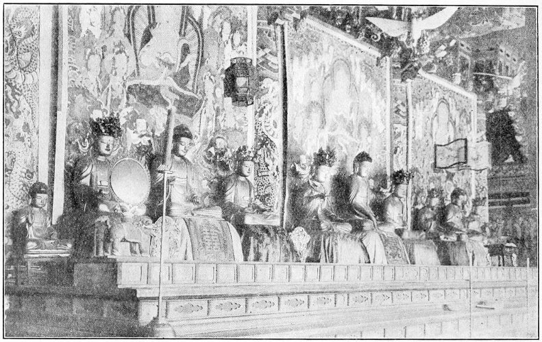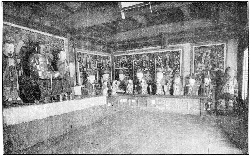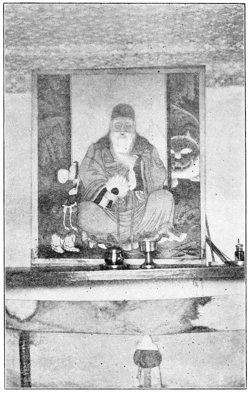 Sometimes there is another very little hall known as the hall of the Lonely Saint. When it occurs it usually stands at the side of the hall of the god of the mountain and is of its size. Within there is a hanging picture of the Lonely Saint. Unfortunately we cannot show a copy of it. We have planned repeatedly to take it but something has always happened to prevent. Trollope tells us that the lonely saint was a historic personage, Chikai, who lived in China in the sixth century, and was the founder of the very ancient Tendai sect.