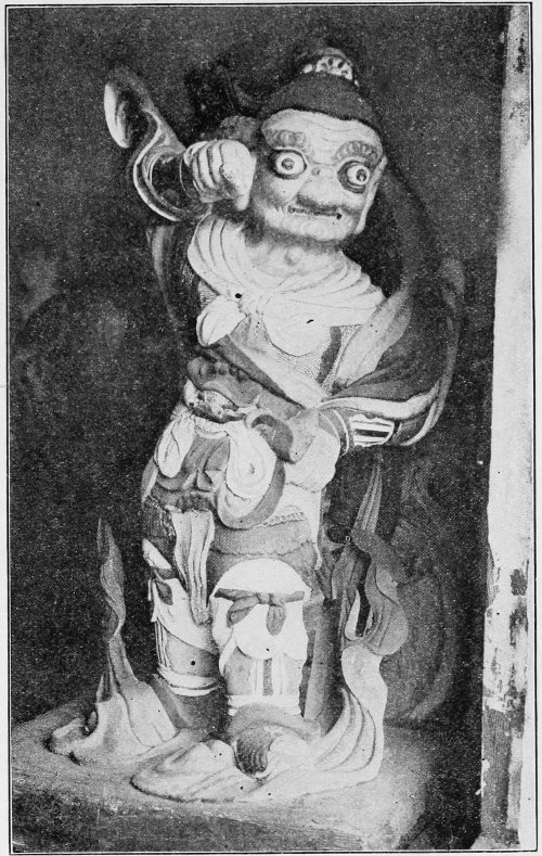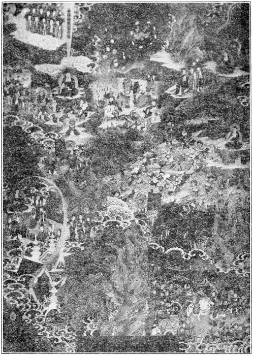 These figures are generally in curious relation with paintings. In most temples where there are figures on the altar there are paintings hung up on the wall behind which usually represent the same beings as the figures, but accompanied by many more attendants. This association of pictures and figures representing the same being is rare, if it occurs, in Japanese Buddhism. (Plate XXVII.)