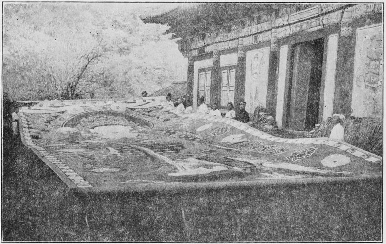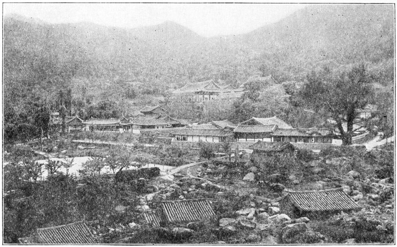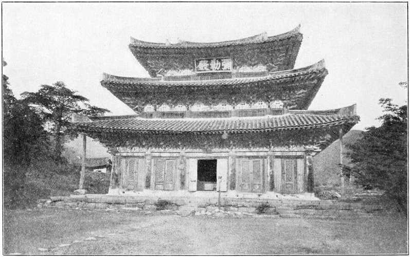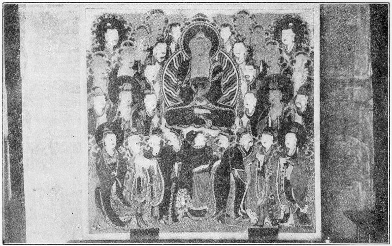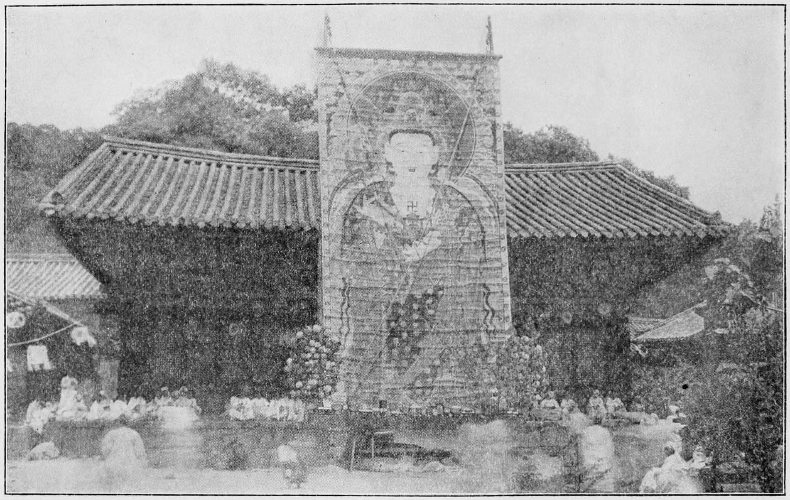 Occasionally—perhaps more commonly than we know—the monasteries possess an enormous rolled painting of a single Buddha. 96 We have seen one at Pawpchu-sa and another at Tongdo-sa. At Pawpchu-sa they brought it out from the great temple and unrolled it for us, in the open, that we might see its size. At Tongdo-sa it was already elevated for the occasion of the celebration of Buddha’s birthday. It towered above the highest building, and was worshipped by the crowding thousands. (Plates XXXVI, XXXVII.)