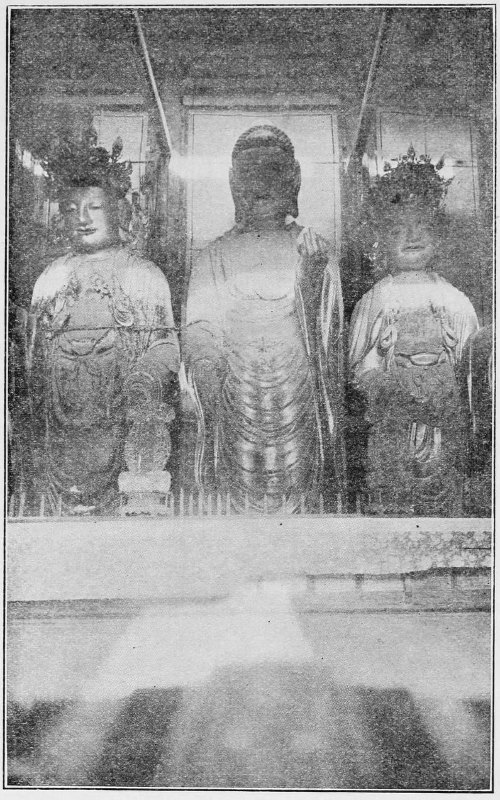 - XXV Great figures of Buddhist Trinity, standing: Kumsan-sa. Amida, Kwannon, Daiseishi. (Thirty feet or so in height) 72