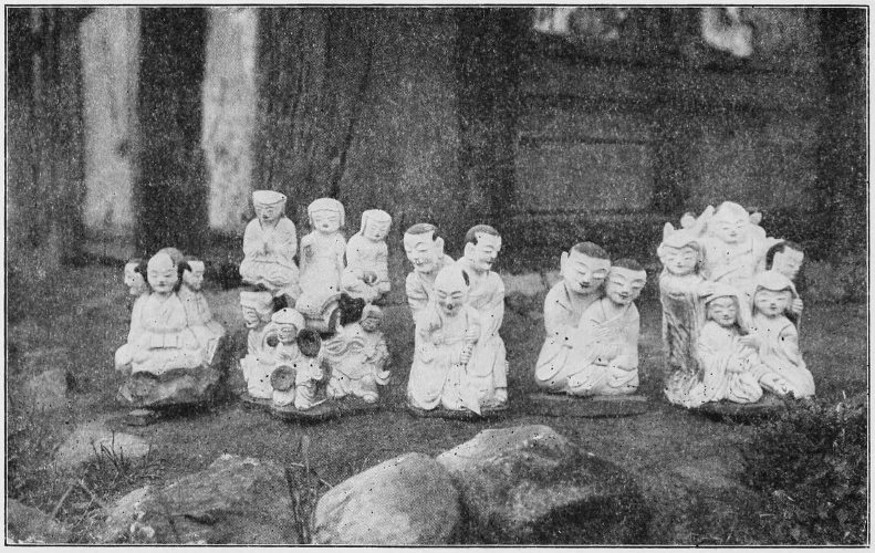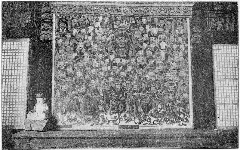 Lastly, we come to paintings. While 90 many are related to figures as just mentioned, many more stand by themselves and are displayed upon the walls of halls and temples without figures. If we desire to make a study of the paintings of a monastery we must pass from hall to hall. Many monasteries are absolute masses of great buildings. In the main temple there are usually figures of a trinity of Buddhas or sometimes even three trinities with paintings hung behind. In the Rakan hall we may find the sixteen Rakan in figures, in paintings, or in combinations. In halls of the five hundred Rakan, we usually find five hundred little figures set on shelves thickly around all three sides; no two are just alike, and it is probable that you will be told with glee that if you look long enough you will find your own father represented among them. (Plates XXIX, XXX.) In the hall of the Ten Kings of Hell we sometimes find the figures of Yama or of Jizo with the ten helpers; if so, behind the figures are frightful paintings of the ten hells, a picture of each one behind its proper king. Sometimes, however, there are only paintings in this hall. (Plate XXVIII.) At some temples there is the hall of the Eight Scenes of the Life of Buddha.[10] These scenes are definite and fixed in every detail, are traditional, and have been passed down for centuries. The whole building is occupied by the eight great paintings hung upon the wall. Each contains a mass of detail, and there may be hundreds of individuals represented in a single scene. (Plate XXXIII.) Occasionally there is a hall of portraits at a monastery; such a one we saw at the monastery where we rebuked the priests for avarice and impoliteness; the building is devoted to the portraits which are said to be reliable representations of the head priests of this monastery for a period of almost fifteen hundred years. One might, however, visit many monasteries without finding such a hall.