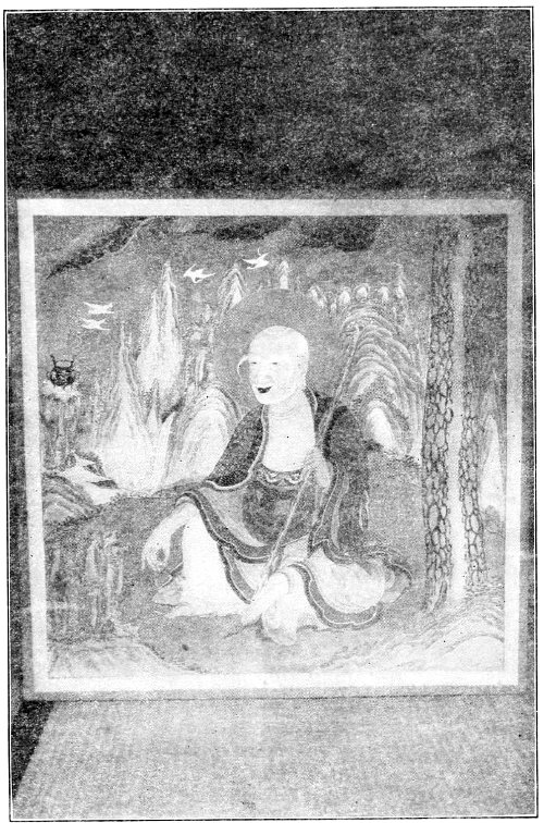 We have already stated that there is considerable variation in the picture of the god of the mountain, though he is always recognizable by certain features. Pictures of individual Rakan are common in temples and these pictures are always precise and definite, giving in every instance the characteristic features or attributes. (Plate XXXV.)