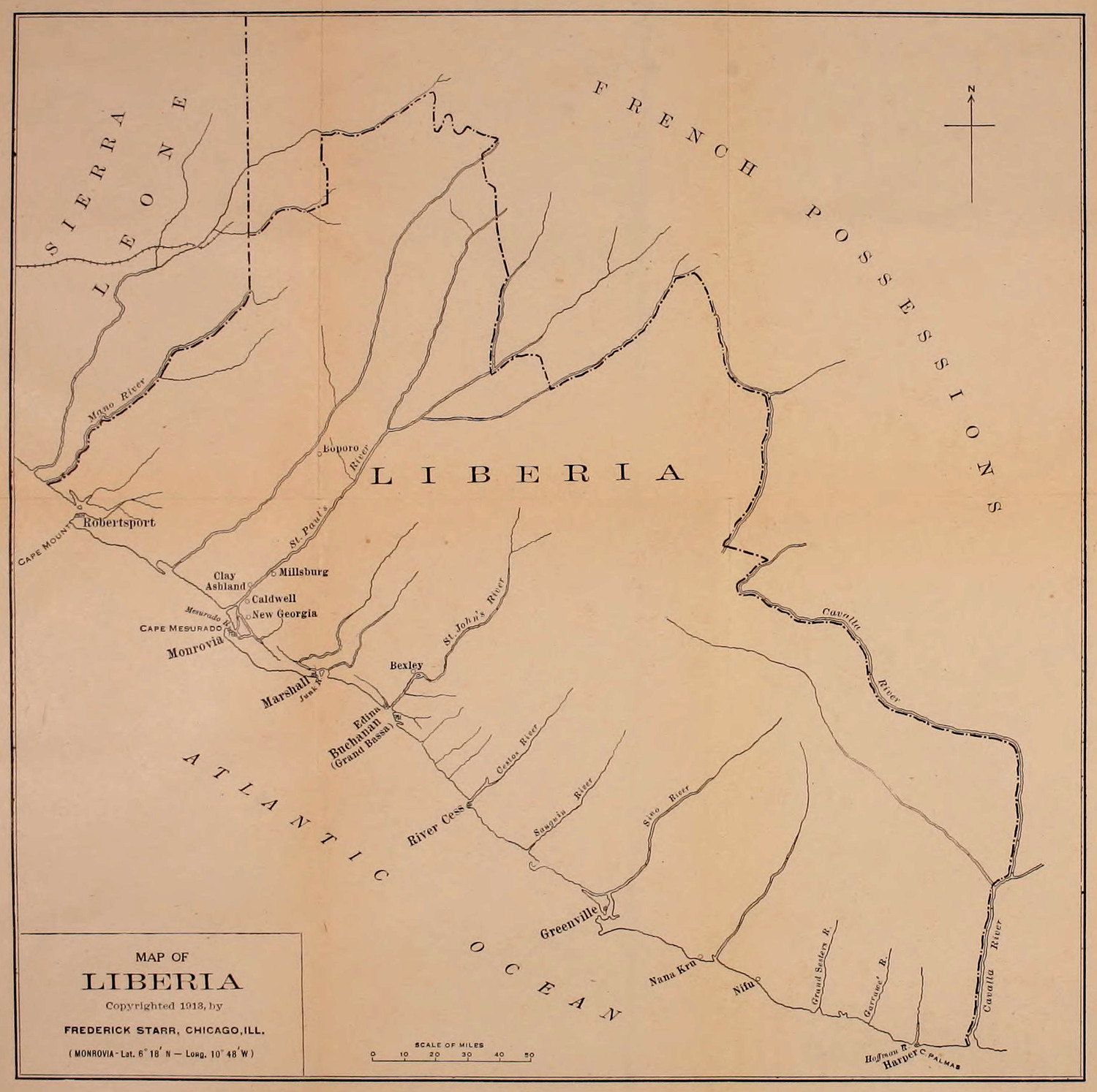 2. Liberia is situated on the west coast of Africa, in the western part of what on old maps was known as Upper Guinea. Both Upper and Lower Guinea have long been frequented by European traders; different parts of the long coast line have received special names according to the natural products which form their characteristic feature in trade; thus we have the Grain Coast, Ivory Coast, Slave Coast, Gold Coast. Liberia is the same as the old Grain Coast and was so called because from it were taken the grains of “Malagueta Pepper,” once a notable import in Europe. Liberia has a coast line of some 350 miles, from the Mano River on the west to the Caballa River on the east and includes the country extending from 7° 33′ west to 11° 32′ west longitude, and from 4° 22′ north to 8° 50′ north latitude. Its area is approximately 43,000 square miles—a little more than that of the state of Ohio.