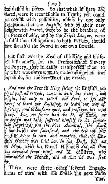 The accompanying reproduction of a page from a book printed in 1690 (place not given, but probably London) illustrates several of the faulty uses of italics common at that time. An entire paragraph is italicized (quite unnecessarily) for emphasis. All proper names and adjectives derived from them are italicized where they occur in the regular text and printed in roman where they occur in italicized passages. Note the frequent capitalization for emphasis and especially the italic capital with roman lower-case in the first line of the second paragraph. This is a frequent usage in this particular book. In this book all quotations are printed in italic without quote marks. The paper, composition, and presswork of the book are very poor. It represents English printing in its worst period.