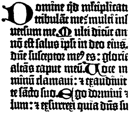 The first types were cut in imitation of the Gothic or black letter handwriting employed at that period in copying Bibles, missals, and the like. It was large and angular and the lines were very coarse and black. These peculiarities gave it the name. Its characteristics made it easy to read even in the dim light of a church or by the failing eyes of the aged. This form of type, however, was only suitable for large pages. When reduced in size it became very difficult to read, being an almost indistinguishable blur on the page.
