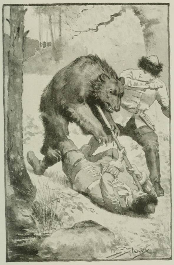 A shout of encouragement behind him, and the sound of rushing feet! "Hold tight there just one minute more!" somebody cries; and automatically the stiffened fingers tighten themselves, and the feet grip the ground. Then a fresh hand grasps the shaft; two powerful feet plant themselves in the place where the failing ones have stood; and as the wearied and vanquished Boris falls fainting to the earth, the new[21] arrival bears upon that stout staff with a force which even the mighty bear cannot withstand.