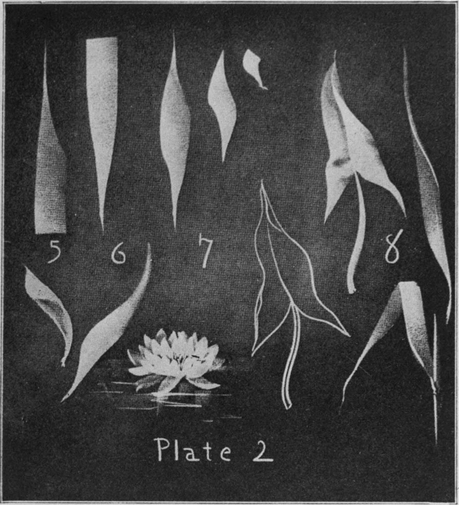 No. 8. Combine two spots similar to the first at No. 7. The leaf in outline requires several lines while the drawing representing the surface was made with two strokes and one[Pg 10] line for the midrib and stem. Try several leaves of different shapes using the stroke suggested on this plate. The pond lily is drawn with this same stroke reduced.