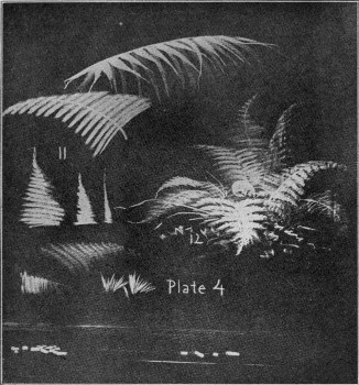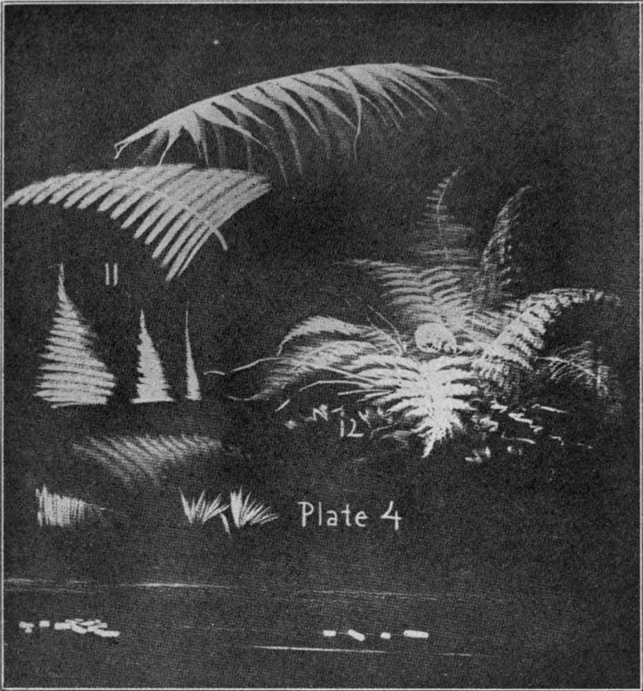 Draw the upper leaf on Plate 4 by the use of stroke No. 6, hardly touching the board for the gray tones, then adding the white tones with a stronger pressure upon the chalk.
