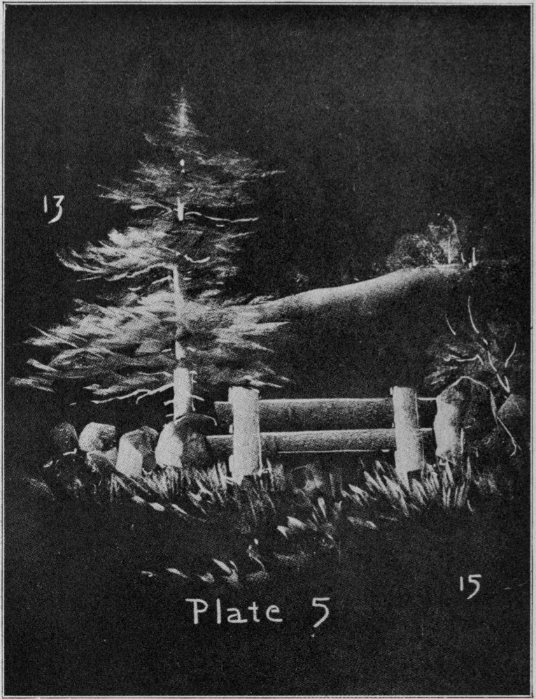 No. 13. Draw a gray, vertical line suggesting the characteristic line of growth in the pine tree. Use the stroke given in No. 11 for the foliage. To represent the foliage in a mass, simply shorten or lengthen the stroke of the chalk, using a greater pressure here and there. With the side of the chalk represent the trunk of the tree where visible and with the point indicate branches.
