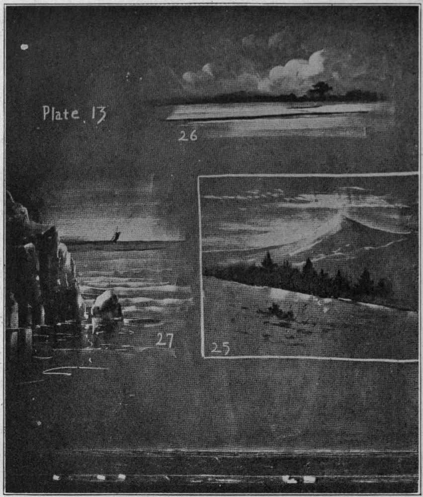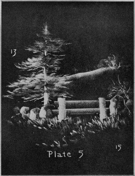 Plate 16. In this sketch use the strokes suggested for illustrations No. 13, Plate 5, and No. 22, Plate 10. Use the side[Pg 27] of the chalk, hardly touching the board and keeping the drawing very gray. Accent with a strong pressure the parts representing snow.