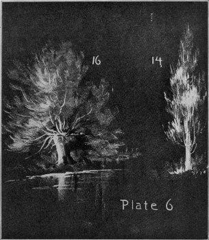 No. 14. Try the poplar tree. Again the vertical line is characteristic. Indicate this. Mass the foliage as before, using a vertical rather than a horizontal stroke. Do not remove the chalk from the board until the mass of foliage is represented and remember to give a light pressure for the grays and a strong one for the whites.