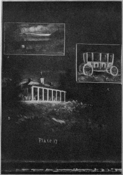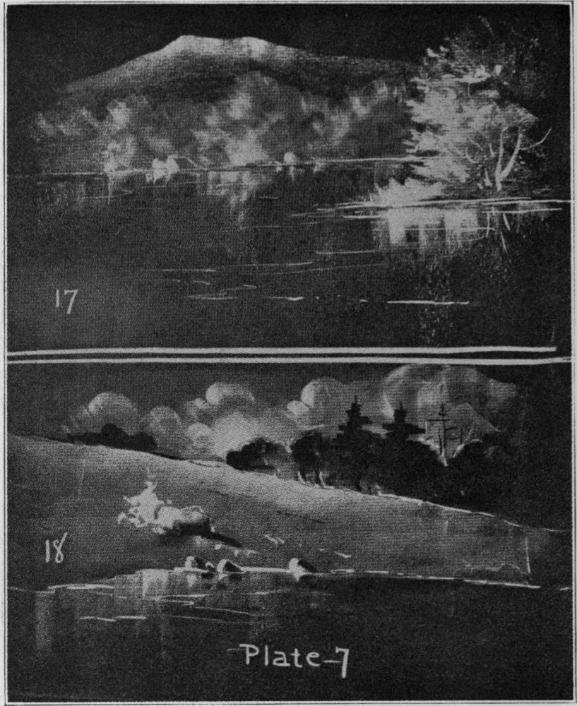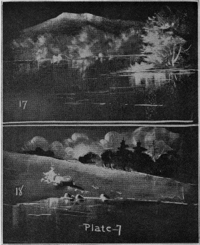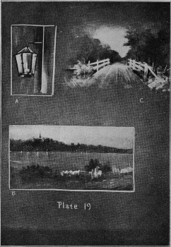 Plate 19 will perhaps suggest its use. In these drawings the board is slightly covered with either chalk or charcoal. In A about ten strokes of the chalk and the charcoal outline finish the drawing of the lantern. B is done almost entirely with [Pg 30]charcoal, the chalk being used only in a few gray tones and the touches of light in the distance. C is produced by using the chalk in horizontal strokes and wiping out the trees with a cloth. A few touches of charcoal will give the foliage, and the bridge is added with simple strokes with the side of the chalk.