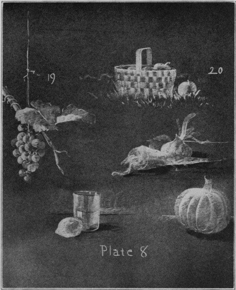 No. 19. Experiment with a few vegetables, or fruit, using the strokes which the illustrations will readily suggest. For the grapes use a short piece of chalk and a quick, curving stroke, the point being used only in accenting.
