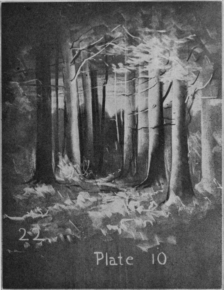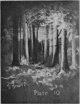No. 22. The woodland appeals to all children and is frequently the topic in history, geography, botany, literature, and nature study as well as drawing. A few broad, gray strokes will give the sky. With a cloth, erase tree tops for the distance and a few vertical lines for tree trunks. Use the vertical strokes suggested in No. 9 for the light tones in the trees and charcoal for the darks to produce the cylindrical effect. Mass the foliage as in the trees previously drawn and add the necessary markings for branches.