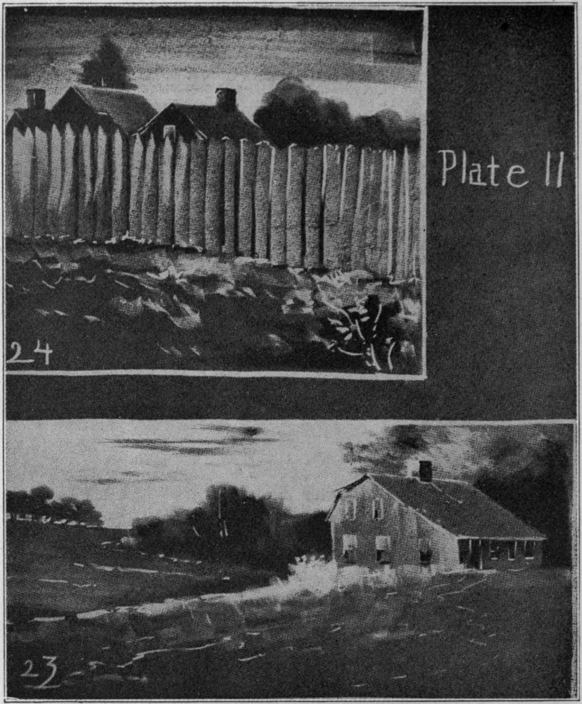 No. 24. This sketch was asked for as an illustration for the study of colonial history. In both No. 23 and No. 24 the sky is drawn by the use of the horizontal stroke and the clouds, trees, and distance erased with a bit of soft cloth. The strokes used in the buildings and fence are evident and need no interpretation.