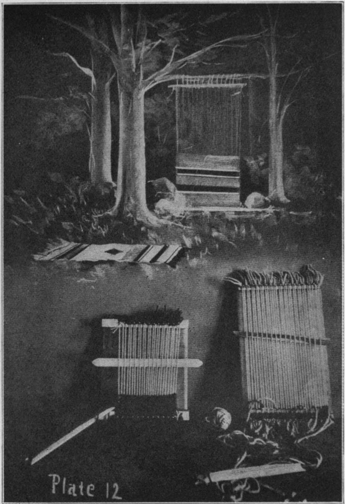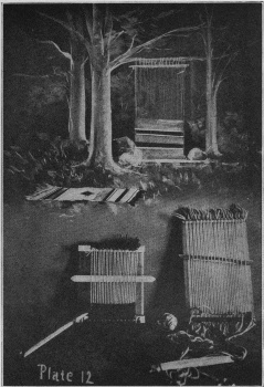 Plate No. 12 shows two looms made by the children, and the beginning of the rugs they are weaving from their own designs. The illustration is from the blackboard drawing made by the teacher to show how the Indians made and used a loom. This illustration has been used in history, geography, and manual training.