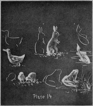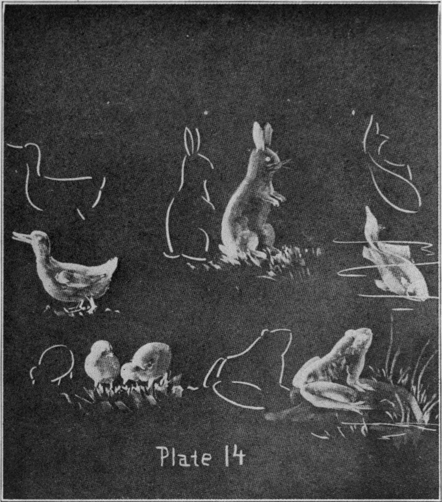 Animal drawing is an extremely interesting lesson for the children, at the same time a rather difficult one for many teachers. On Plate 14 will be found a few drawings suggesting how few lines will indicate the general outline and how few strokes of the side of the chalk will suggest the surface.