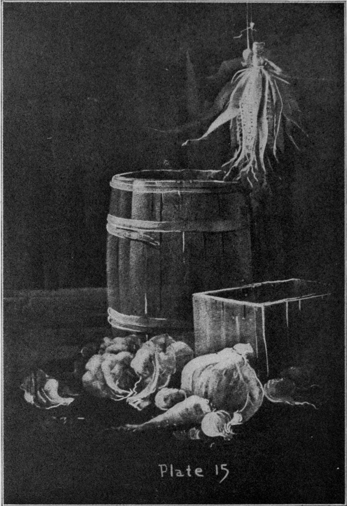 Plate 15. This drawing will answer as an illustration of harvest time, or perhaps the gift itself to be packed and sent away. Our lesson in object drawing may be from these or similar objects. In this sketch a few vertical strokes give the background and box, similar curving strokes the barrel, and [Pg 25]horizontal strokes the floor. The vegetables are drawn by using the suggestions found in No. 9, Plate 3. The kernels of corn are represented by the use of a very small piece of chalk and stroke No. 10, and the husks by using No. 5, No. 6, and No. 7, Plate 2. The details are added with the point of the chalk, and charcoal is used in the shadows.