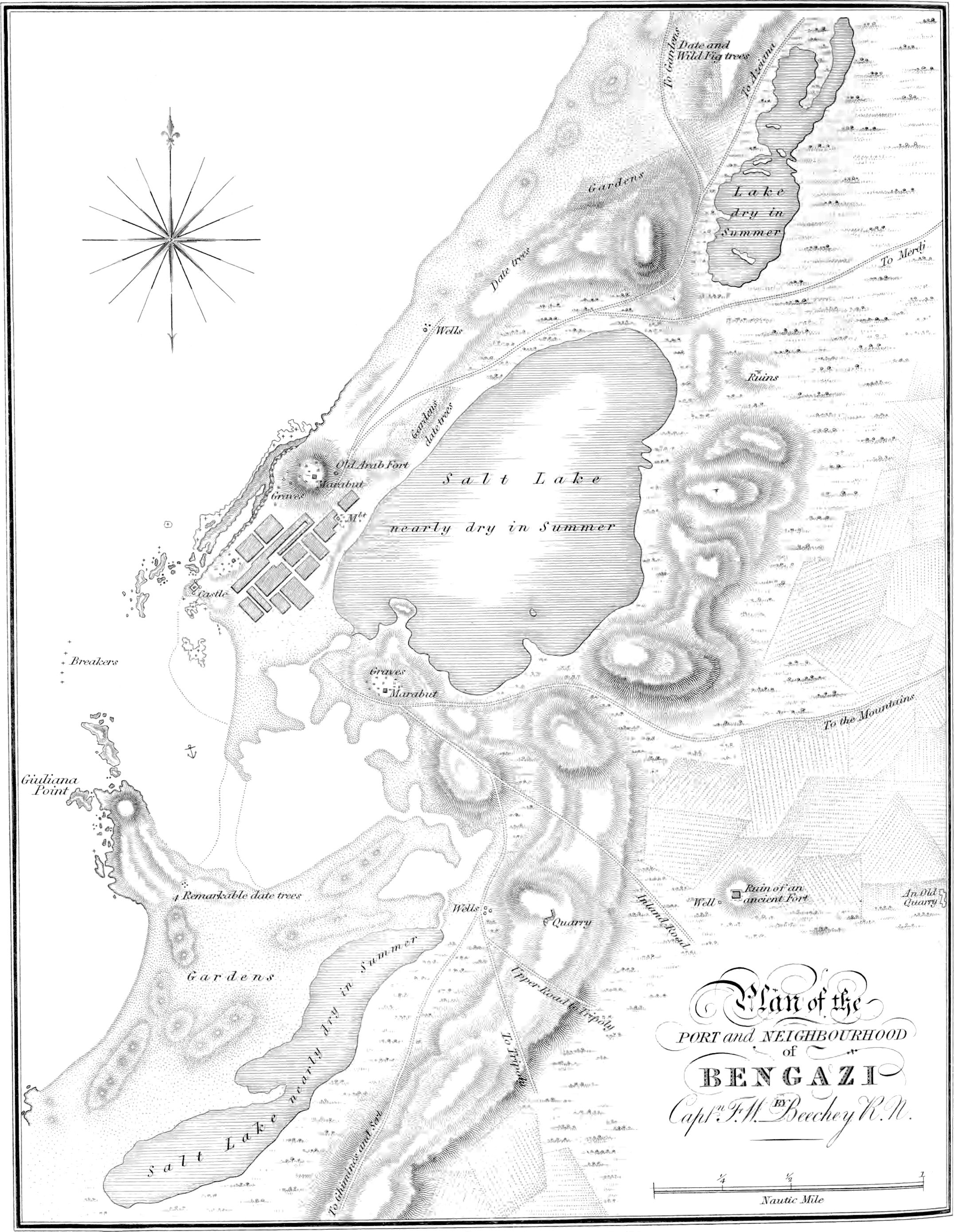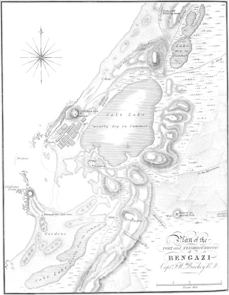 | The Rainy Season sets in at Bengazi towards the middle of January, and continues with little interruption till the beginning of March — Miserable Condition of the Town during that period — Construction of the Houses — Improvidence of the Arabs — Dirty state of the Streets — Swarms of insects which infest them — Position of Bengazi — Description of its Harbour — Castle of the Bey — Visit to Bey Halīl — Friendly Reception of our Party by his Excellency — Occupations and arrangements during the Rainy Season — The Shekh el Belad Mahommed — Jews of Bengazi — Trade of the Town — Produce of the Environs — Wretched state of the Bullock Vessels — Mahometan Inhabitants of Bengazi — Alarm of the Lower Classes during our residence there — Confusion resulting from it — Mob collected at our door on this occasion — Narrow Escape of Mr. Giacomo Rossoni — Friendly Conduct of our Mahometan Acquaintance — Parley with the Arabs — Dispersion of the Mob — Prejudices of the Arabs respecting the Treatment of Diseases — Fatal Effects of this species of Folly at Bengazi — Prevalent Diseases[xiii] in Bengazi and its vicinity — Singular cause of Alarm among a Party of Arab Shekhs — Arab notions of decorum and propriety contrasted with those of European Nations — Bengazi supposed to occupy the Site of Berenice and Hesperis — Existing Remains there — Little regard manifested by Turks and Arabs for the relics of Antiquity — Probable Limits of Berenice — Quarries, and singular Chasms in its Neighbourhood — Gardens of Hesperides — Position of the Gardens according to Scylax, Pliny, and Ptolemy — Conjectures of Gosselin and others respecting them — Circumstances which appear to favour our position of the Gardens — Lakes and Subterranean Caverns in the Neighbourhood of Bengazi, (or Berenice) — Concealed Body of Water observed in one of the latter — Examination of the Caverns — Remarks of the Bey respecting it — The Subterranean Stream in question considered as the River Lathon, or Lethe — Testimonies of the Ancients on this point — Supposed Communication of the Subterranean Stream with the Lake adjoining the Harbour of Bengazi — Signification of the term Lathon alluded to — Further Remarks in confirmation of our suggested Position of the River, and of its probable Communication with the Lake above mentioned — Remarks of Strabo and Cellarius on the subject — Temple of Venus, and Lake Tritonis of Strabo — Remarks on the name Berenice — Total ignorance of the Arabs of Bengazi with respect to the former celebrity of their City — Pleasing little Fable of Kazwini, on the changes which take place in the Nature and Appearance of Places, and the little knowledge which remains, after a lapse of time, of their former Condition, even on the spots where they existed | 281 |