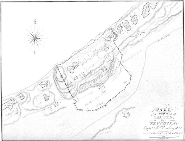 | Departure of the Expedition from Tripoly — Passage through Tagiura — Fertile appearance of the latter — Its Mosque, and actual remains — Tagiura considered as the site of Abrotonum — Existence of a Salt-water Lake at Tagiura, consistent with Strabo’s account of Abrotonum — Present tranquil condition of the Country in this Neighbourhood contrasted with its dangerous state in the time of Consul Tully — Sand-heaps to the eastward of Tagiura —[viii] Remarks on their formation, and on the accumulation of Sand in other places — Dangers of the Sand-storm considered — Passage over the Sandy Tract to the eastward of Tagiura — Arrive at Wady Ramleh — Stormy weather at that place — Take leave of our European friends who had accompanied us from Tripoly — Continuance of the gale — Arrive at Wady’m’Seyd — Attempt to pass, without success, across the Sand-hills to the Coast — Arrive at Guadigmata — Position of Graphara, as laid down by Scylax, considered — Ancient remains discovered by Captain Smyth in the neighbourhood of Wady’m’Seyd and Abdellata — Remarks on these, considered as the remains of Graphara — Scuffle with the Arabs at Sidy Abdellati — Remains at that place indicative of an ancient military station — Cross the range of Selem — Extensive view from its summit over the fertile plains of Lebida and Jumarr — Rains still continue — Distress of the Camels — Meet with the English Consul on his return from an Excursion to Lebida — Report of a troop of marauding Arabs lying in wait for our Party | 33 |