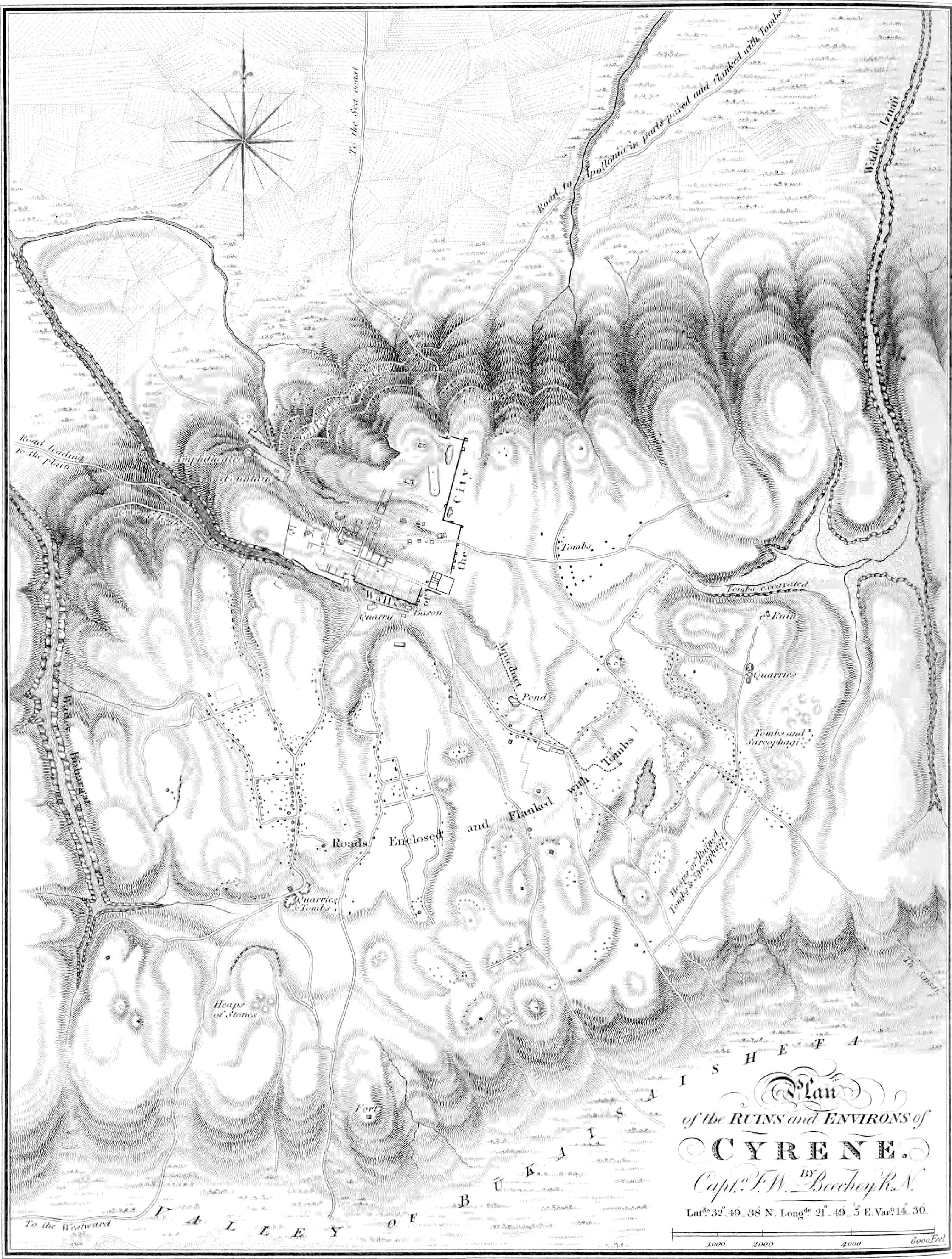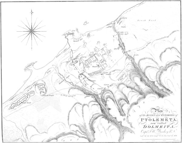 | Actual Condition of the City of Teuchira — Perfect State and great Strength of its Walls — Suggested Period of their Erection — Mode in which they are constructed — Gates of the City — Narrow Passage communicating with them — Probable Advance of the Sea at Teuchira — Line described by the Walls — Estimated Circuit of them according to Signor Della Cella — Greek Inscriptions cut in various parts of them — Suggestions of Signor Della Cella respecting them — Actual Nature of the Inscriptions — Excavated Tombs in the Quarries of Teuchira — Egyptian Names of Months generally adopted by the Inhabitants of the City — General Nature of the Plans of the Tombs — Some of the Bodies appear to have been burnt, and others to have been buried entire — No Difference appears to have obtained at Teuchira between the Modes of Burial adopted by its Greek and Roman Inhabitants — Encumbered State of what are probably the earliest Tombs — Solitary instance of a Painted Tomb at Teuchira — Remains of Christian Churches, and other Buildings within the Walls — Disposition of the Streets — Remains without the Walls — No Statues, or Remains of them, discovered by our Party at Teuchira — Remarks on the Wall of Ptolemeta — Remains of a Naustothmos, or Naval Station, observed there — Other Remains of Building on the Beach near the Station — Further traces of the City-Wall — Dimensions of Ptolemeta — Remains of Theatres found there — Description of the larger one — Ruins described by Bruce as part of an Ionic Temple — Other Remains in the Neighbourhood of these — Remarks on the Style of some of the Buildings of Ptolemeta, as contrasted with those of Egypt and Nubia — Probable Date of its existing Remains | 367 |