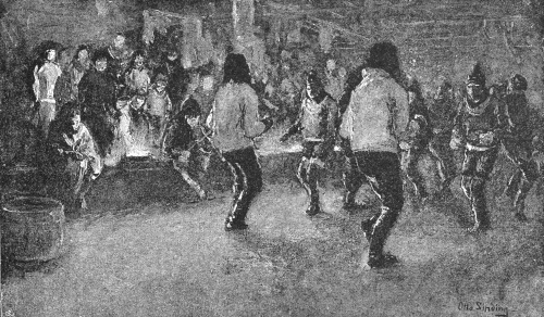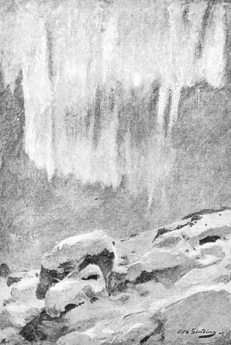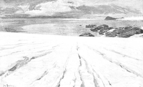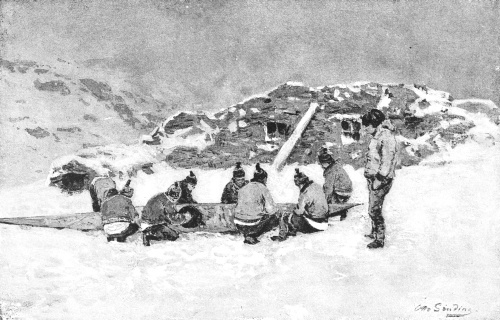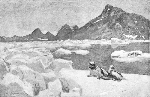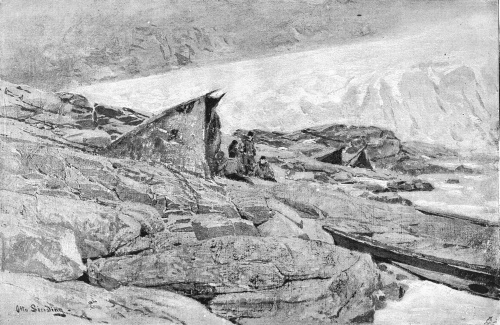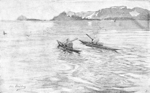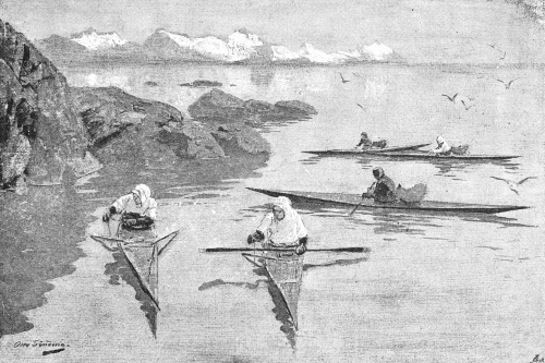 Everything in Greenland is simple and great—white snow, blue ice, naked, black rocks and peaks, [3] and dark stormy sea. When I see the sun sink glowing into the waves, it recalls to me the Greenland sunsets, with the islets and rocks floating, as it were, on the burnished surface of the smooth, softly-heaving sea, while inland the peaks rise row on row, flushing in the evening light. And sometimes when I see the sæter-life[2] at home and watch the sæter-girls and the grazing cows, I think of the tent-life and the reindeer-herds on the Greenland fiords and uplands; I think of the screaming ptarmigan, the moors and willow-copses, the lakes and valleys in among the mountains where the Eskimo lives through his brief summer.