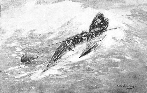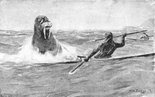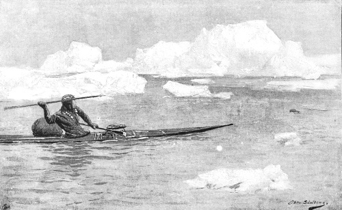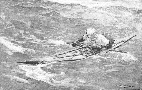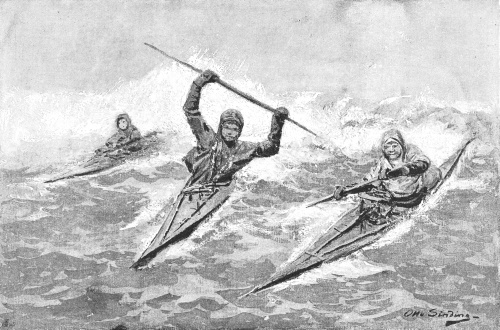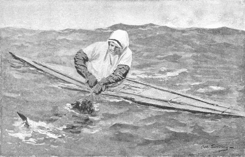 During the long, dark evenings, as I sat in the low earth-huts and gazed at the flame of the train-oil lamps, I had ample time for reflection. It often seemed to me that I could see these hardy children of Nature pressing westward, stage by stage, in their dog-sledges and in their wonderful skin-canoes, along the barren ice-coasts; I saw how they fought their way onward, and, little by little, perfected their ingenious[ix] implements and attained their masterly skill in the chase. Hundreds, nay thousands, of years passed, tribe after tribe succumbed, while other and stronger stocks survived—and I was filled with admiration for a people which had emerged victorious from the struggle with such inhospitable natural surroundings.