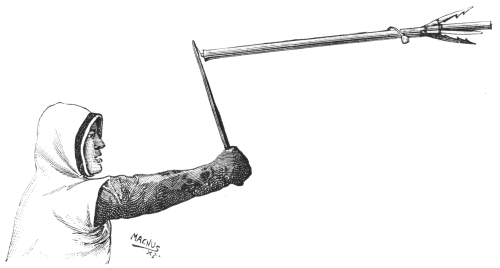 [169] It has hitherto been supposed that there are no traces of such intercourse except in the Eskimo legends (mentioned in Chapter I.), of their encounters with the old Scandinavians, and in the three following words: nîsa for nise (porpoise), kuánek for kvanne (angelica) and kalâlek (meaning Greenlander). The derivation of nîsa (old Norse nisa) and kuánek seems probable enough, though some doubt is thrown on the latter by the fact that in Labrador the word is applied to an eatable seaweed. Kalâlek was supposed to be the same as the Norwegian skrælling—the name given by our forefathers to the Eskimos, which in an Eskimo’s mouth would sound something like kalalek. It is rather surprising, however, to find the same word among the Eskimos of Alaska in the form of katlalik or kallaaluch, meaning an angekok or chieftain (Rink, Meddelelser om Grönland, part 11, Suppl. p. 94; Tales and Traditions of the Eskimo, Danish ed. suppl. p. 200). It is possible, however, that the word may have been imported into Alaska from Greenland in modern times. Another thing which, as it seems to me, may possibly be a relic of the old Scandinavians, is the cross-bow which Holm found upon the east coast, and which was formerly in use on the west coast also. So far as I know, it is not found among the Indians.