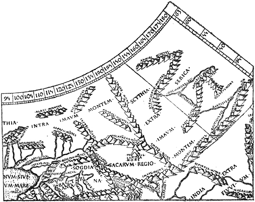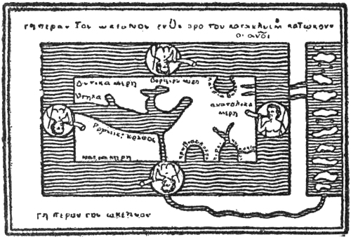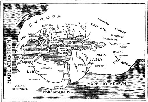According to the common Greek idea it was the countries of the Mediterranean and of the East that formed the disc of the earth, or “œcumene” (the habitable world). Around this disc, according to the Homeric songs (the Iliad was put into writing about 900 B.C.), flowed the all-embracing river “Oceanus,” the end of the earth and the limit of heaven. This deep, tireless, quietly flowing river, whose stream turned back upon itself, was the origin and the end of all things; it[Pg 9] was not only the father of the Oceanides and of the rivers, but also the source whence came gods and men. Nothing definite is said of this river’s farther boundary; perhaps unknown lands belonging to another world whereon the sky rested were there; in any case we meet later, as in Hesiod, with ideas of lands beyond the Ocean, the Hesperides, Erythea, and the Isles of the Blest, which were probably derived from Phœnician tales. Originally conceived as a deep-flowing river, Oceanus became later the all-embracing empty ocean, which was different from the known sea (the Mediterranean) with its known coasts, even though connected with it. Herodotus (484-424 B.C.) is perhaps the first who used the name in this sense; he definitely rejects the idea of Oceanus as a river and denies that the “œcumene” should be drawn round, as though with a pair of compasses, as the Ionian geographers (Hecatæus, for example) thought. He considered it proved that the earth’s disc on the western side, and probably also on the south, was surrounded by the ocean, but said that no one could know[Pg 10] whether this was also the case on the north and north-east. In opposition to Hecatæus[1] and the Ionian geographers (the school of Miletus) he asserted that the Caspian Sea was not a bay of the northern Oceanus, but an independent inland sea. Thus the “œcumene” became extended into the unknown on the north-east. He mentions several peoples as dwelling farthest north; but to the north of them were desert regions and inaccessible mountains; how far they reached he does not say.
