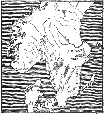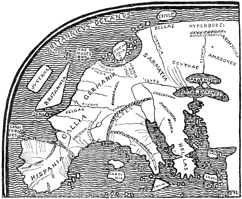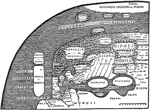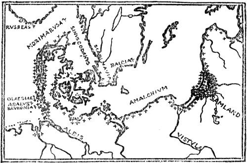 The world which the Greeks really knew was bounded in the earlier period on the north by the Balkans. These again gave rise to the mythical Rhipæan Mountains, which were soon moved farther to the north or north-east[7] as knowledge increased, and so they and the Alps were made the northern boundary of the known world. As to what lay farther off, the Greeks had very vague ideas; they seem to have thought that the frozen polar countries began there, where it was so cold that people had to wear breeches like the Scythians; or else it was a good climate, since it lay north of the north wind which came from the Rhipæan Mountains. But that some genuine information about the North had reached them as early as the time of the Odyssey seems to be shown by the tale of the Læstrygons—who had the long day, and whose shepherds, driving their flocks in at evening, could call to those who were setting out in the morning, since the paths of day and night were with them so close to one another—and of the Cimmerians at the gates of the underworld, who lived in a land of fog, on the shores of Oceanus, in eternal cheerless night. It is true that the poet seems to have imagined these countries somewhere in the east or north-east, probably by the Black Sea; for Odysseus came from the Læstrygons to the isle of Ææa “by the mansions and dancing-places of the Dawn and by the place where the sun rises.” And from Ææa the Greek hero steered right out into the night and the mist[Pg 14] on the dangerous waters of Oceanus and came to the Cimmerians,[8] who must therefore have dwelt beyond the sunrise, shrouded in cloud and fogs. It might be supposed that it was natural to the poet to believe that there must be night beyond the sunrise and on the way to the descent to the nether regions; but it is, perhaps, more probable that both the long day and the darkness and fog are an echo of tales about the northern summer and the long winter night, and that these tales reached the Greeks by the trade-routes along the Russian rivers and across the Black Sea, for which reason the districts where these marvels were to be found were reported to lie in that direction. A find in the passage-graves of Mycenæ (fourteenth to twelfth century B.C.) of beads made of amber from the Baltic,[9] besides many pieces of amber from the period of the Dorian migration (before the tenth century) found during the recent English excavations of the temple of Artemis at Sparta,[10] furnish certain evidence that the Greek world had intercourse with the Baltic countries long before the Odyssey was put into writing in the[Pg 15] eighth century, even though the northern lands of this poem seem to have been limited by a communication by sea between the Black Sea and the Adriatic, running north of the Balkan peninsula. Perhaps this imaginary communication may have been conceived as going by the Ister (Danube), which, at any rate later, was thought to have another outlet in the Adriatic. We may also find echoes of tales about the dark winter and light summer of the North in Sophocles’s tragedy, where we are told that Orithyia was carried off by Boreas and borne over