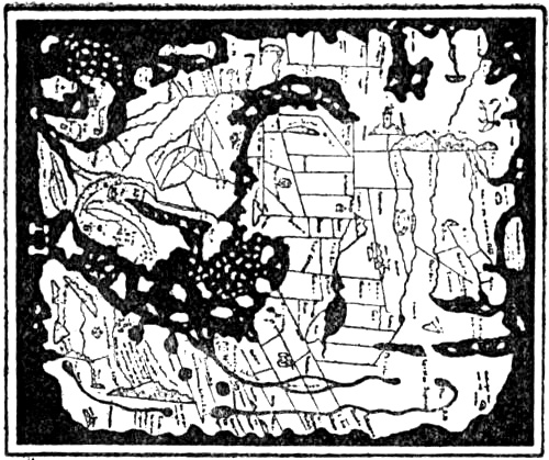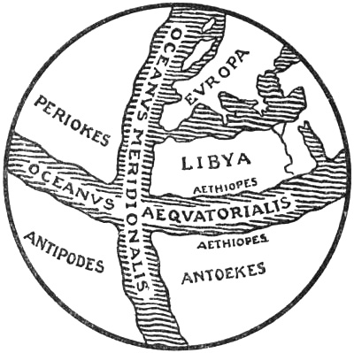 Parmenides of Elea (about 460 B.C.) divided the earth’s sphere into five zones or belts, of which three were uninhabitable: the zone of heat, or the scorched belt round the equator, and the two zones of cold at the poles. Between the warmth and the cold there were on either side of the hot zone two temperate zones where men might live. This division was originally derived from the five zones of the heavens, where the Arctic Circle formed the boundary of the northern stars that are always visible, and the tropics that of the zone dominated by the sun. Pythagoras seems to have been the first to transfer it to the globe, the centre of the universe.[5] This idea of the earth’s five habitable and uninhabitable zones was current till nearly the end of the Middle Ages; but at the same time one finds, often far on in the Middle Ages, the former conceptions of the empty ocean encircling all, and of the “œcumene” swimming in it as an island. Occasionally we meet with a vast unknown continent beyond this ocean, belonging to another world, which no one can reach.[6] Together with these theories, though not very conspicuously, the belief in the immeasurable gulf at the edge of the world also persisted; and this became the “Ginnungagap” of our forefathers.