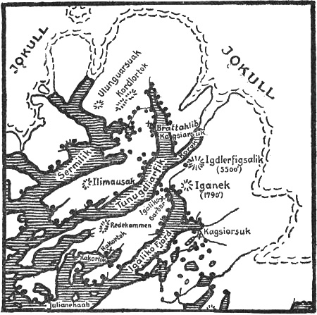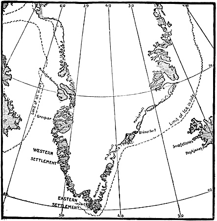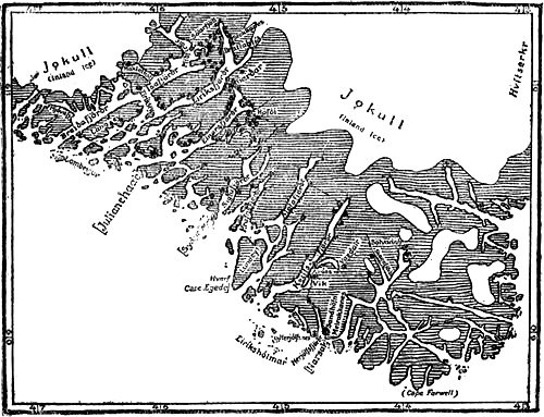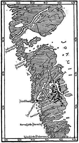[290] The text says that these islands were to the south of “Snæfell”; but where this was we do not know. In the Saga of Eric the Red we read that in the third summer Eric (see above, p. 267) “went as far north as ‘Snæfell’ and into ‘Hrafns-fjord.’” Whether this was the same Snæfell is uncertain, but quite possible; while Hrafns-fjord (Ravnsfjord) is most probably to be regarded as the Hrafnsfjord that lay in the Eastern Settlement, near Hvarf.