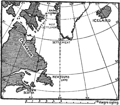 [315] If we assume that a “dœgr’s” sailing is equal to two degrees of latitude or 120 nautical miles (twenty-four ancient sea-leagues), then, as shown on the map above, it will be about four dœgr’s sail from Greenland to the nearest part of Labrador (not two). From Bjarneyjar to Markland should be four dœgr according to the saga; but the map shows that it is between eight and ten dœgr from the Western Settlement along the coast of Labrador to Newfoundland. On the other hand, between Newfoundland and Cape Breton two dœgr’s sail will suit better.