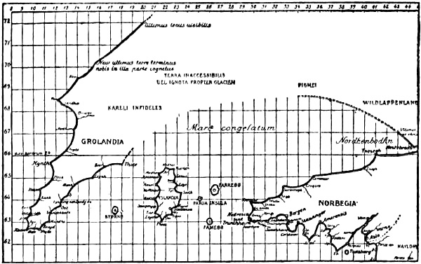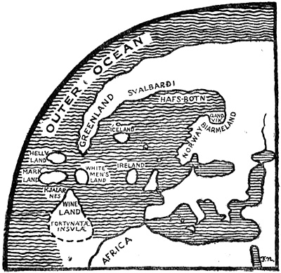 If this runic inscription from Ringerike has been correctly copied and interpreted—which, as has been said, is uncertain—then this and Adam of Bremen’s information from Denmark would show that Wineland was known and discussed in various parts of the North in the eleventh century, long before Icelandic literature began to be put into writing. But strangely enough, in the Norwegian thirteenth-century work, “Historia Norwegiæ,” no mention is made of Wineland, although in other respects the author has made extensive use of Adam of Bremen’s work; he merely states that Greenland approaches the African Islands, by which, as pointed out above (p. 1), he shows clearly enough that Wineland was regarded as belonging to the African Islands, or Insulæ Fortunatæ. The “King’s Mirror,”[22] which gives a detailed description of Greenland, does not mention Wineland, although the author evidently held the view that Greenland approached the universal continent (i.e., Africa) on the south. The knowledge of it must soon have been forgotten in Norway, or it was regarded as a mythical country, while the tradition persisted longer in Iceland.