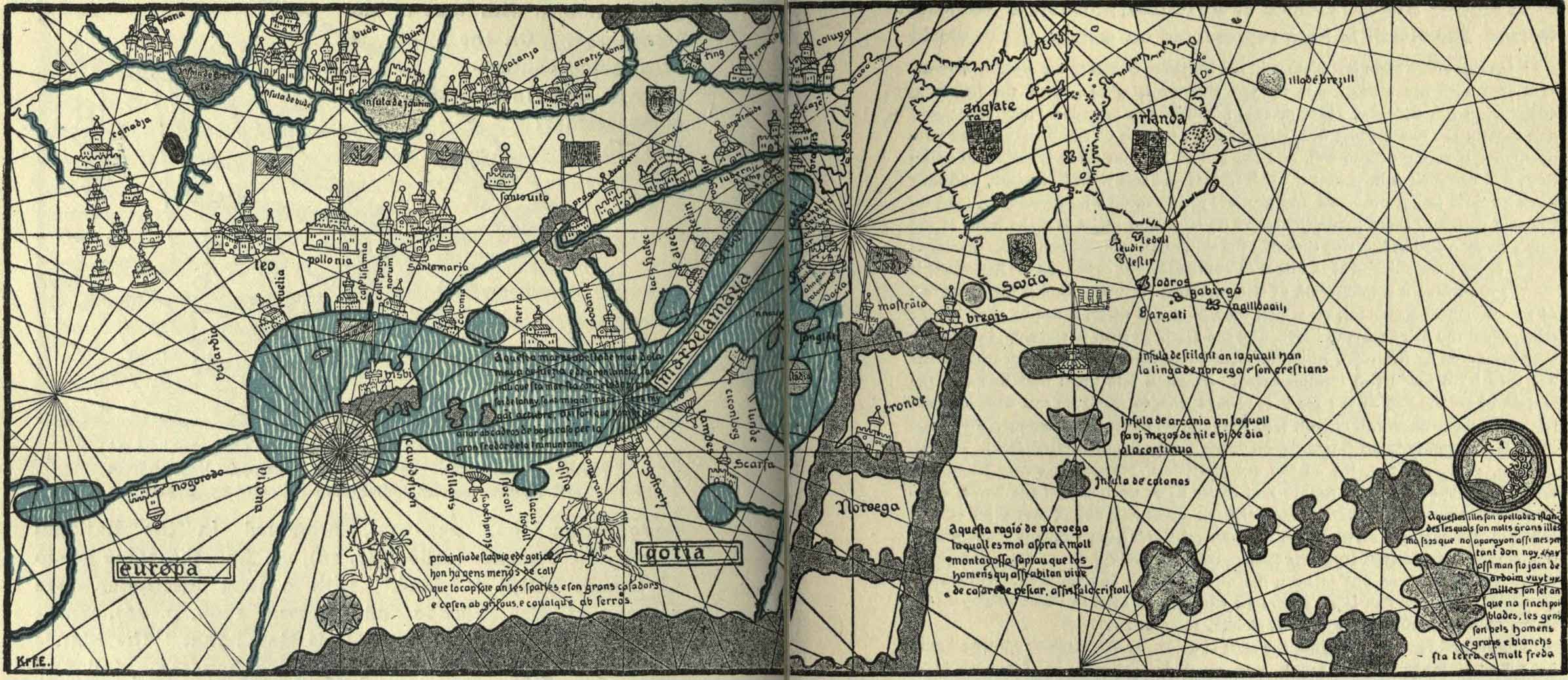 [310] That the distance between these islands and Cauo de Ynglaterra is less than half what it ought to be on La Cosa’s map cannot be considered of decisive importance, since, as we have seen, the distances on this map are in general not to be relied on. The name “S. Grigor” must certainly be due to the Englishmen, while “Y. verde” may be due to Cabot or to La Cosa, and may be the same name as is found on compass-charts of the fifteenth century (cf. above, p. 279). La Cosa or Cabot may have taken these two islands to be the same as “Illa verde” and “Illa brazil” on these older charts, and while one of the islands has been given a new name perhaps because there were other islands with the name of Brazil (?), or because this island was nameless on some of the compass-charts; see above, p. 281, the other has been allowed to retain the old name, which was originally a translation of Greenland. This old land of the Norsemen is here brought far to the south, and reduced to a very modest size, being confused with peninsulas of Newfoundland.