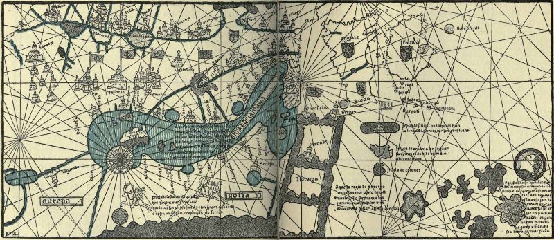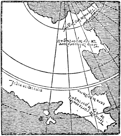 [351] This land connection is found on the Canerio map of 1502-1507, which is of the same type as the Cantino map and is an Italian copy, either of the Cantino map itself or of a similar Portuguese map of 1501 or 1502 [cf. Björnbo, 1910, p. 167].
