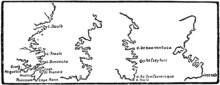 [314] Another possible explanation is that Cauo de Ynglaterra, Cabot’s most eastern point of the country, was Cape Race in Newfoundland, in spite of Sebastian Cabot’s having placed it at Cape Breton. As has been said, it is very doubtful whether Sebastian Cabot was with his father in 1497, though on the other hand he probably knew his father’s map, and in 1544 had a copy of it, or at any rate of La Cosa’s. Then he saw the French maps representing Cartier’s discoveries, e.g., Deslien’s map of 1541; and it was a question of identifying his father’s discoveries with this map. It would then be perfectly natural to assume that C. de Ynglaterra answered to Cape Breton, which looked like the easternmost point of the mainland in that region, while farther east there was a group of islands which might well answer to S. Grigor and Y. Verde on La Cosa’s map. Perhaps he also had a note to the effect that it was on St. John’s day that the first land was sighted. On his father’s map he found an island of St. John off this promontory, or he knew it from the tradition of Reinel’s and later maps, and so placed his “Prima tierra vista” at Cape Breton. If the view that C. de Ynglaterra is Cape Race be regarded as correct, it might be assumed that Cauo descubierto was really the place where Cabot first made the land, perhaps in the neighbourhood of Cape Breton, and that from thence he sailed eastward, the supposed 300 leagues, along the south coast of Newfoundland. The two islands he discovered to starboard might then be Grand Miquelon and St. Pierre, though this is not very probable, and he would then have sailed between them and the land. But in that case we have a difficulty with the two islands, S. Grigor and Y. Verde, which must then lie east of Cape Race, where no islands exist. That they were icebergs taken for islands is not very likely. It is more probable that, as already suggested, they are the ghosts of the “Illa Verde” and “Illa de Brasil” of earlier compass-charts (of the fifteenth century; see above, pp. 279, 318). But the whole of this explanation seems rather artificial, and the even coast of La Cosa’s map is difficult to reconcile with the extremely uneven coast-line we should get between Cape Breton Island and Cape Race. There is the further difficulty, if La Cosa’s coast was the south coast of Newfoundland, that we should have to assume that John Cabot was aware of the variation of the compass, and allowed for it on his chart.