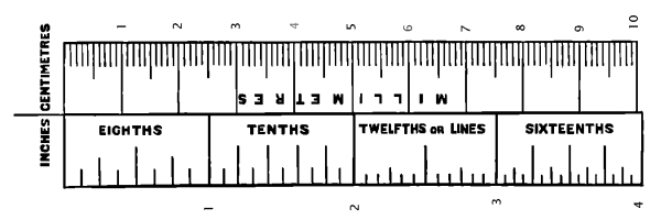 Measurements and Weights.—The authors regret to have been unable to adopt one standard system of stating measurements. They have mostly employed the English inch: the accompanying woodcut will facilitate its comparison with the French decimal scale. The word millimetre is indicated in the text by the contraction mm.; micromillimetre, signifying the thousandth part of a millimetre, and only used in reference to the microscope, is abbreviated thus, mkm.