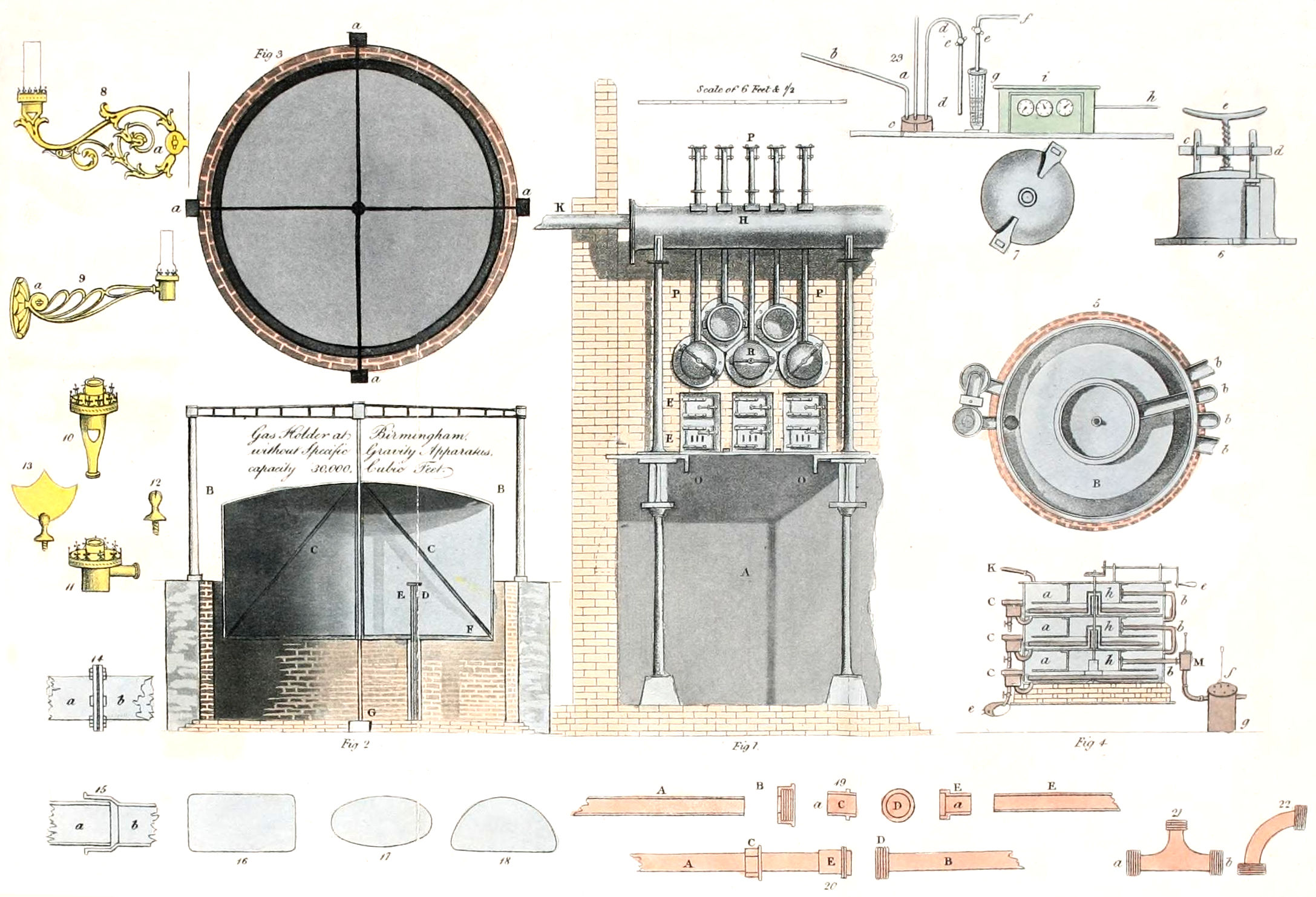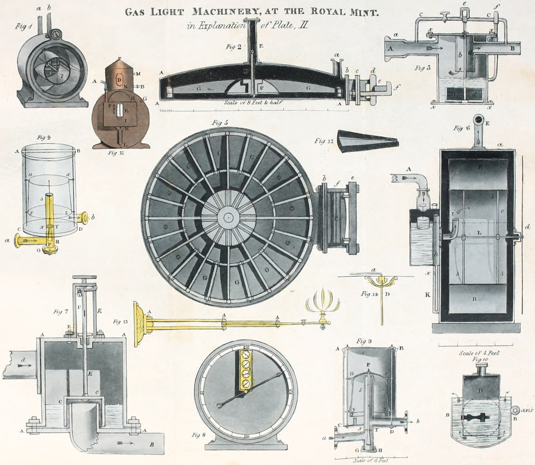 In the tenth part, I have given a description of an entirely new machine, called the gas-metre, or self-acting guage, lately adopted at the Birmingham, Chester, and other gas works, which measures and registers the quantity of gas manufactured in any given time, from any given quantity of coal, or consumed during any period, by any number of burners or lamps. The great services which such a machine must render both to the manufacturer and consumer of gas, are particularly pointed out, and illustrated to the manufacturer, by serving as a complete check on his workmen as to the quantity of work that ought to be performed, and to the consumer, as an exact measure of the quantity of gas he receives, and ought to pay for.