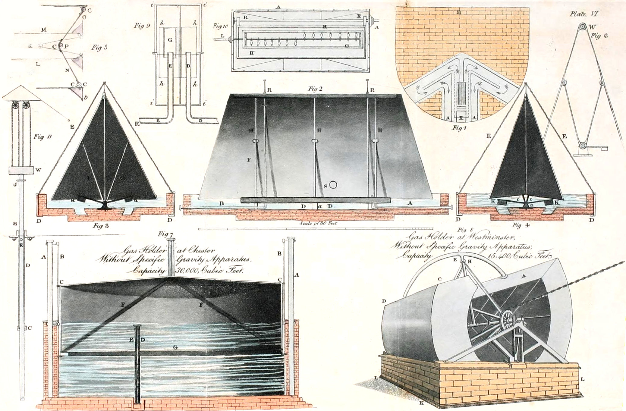 The ninth part gives an account of the various improved gas holders which have been invented, and now are in action at the most recent establishments, for the purpose of storing large quantities of gas. The improvements that have been made in this department of the Gas Light machinery, are particularly valuable and have contributed more perhaps than any other, to lessen the expence of manufacturing gas for commercial purposes.